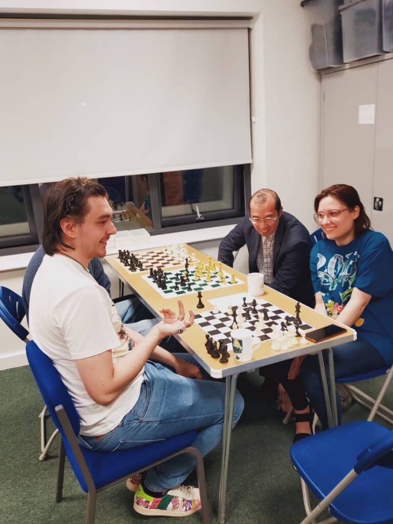 To make things worse Crewe B beat Crewe A in the match. Harry and Carmel drew in 13 moves (eh?). In contrast Lukasz and Martin F, 2 of the most adventurous players in the club, played an expectedly wild game, with Lukasz winning. Gee beat Jamie on board 2.