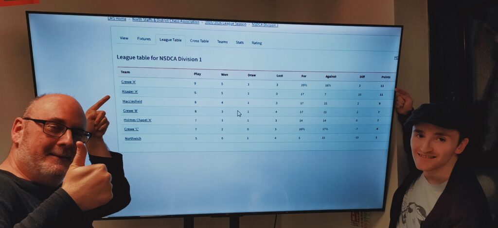 Pictured above are 2 intrepid members of the Crewe A team, as they enjoy the view from the summit of the NSDCA league table; read on for details.